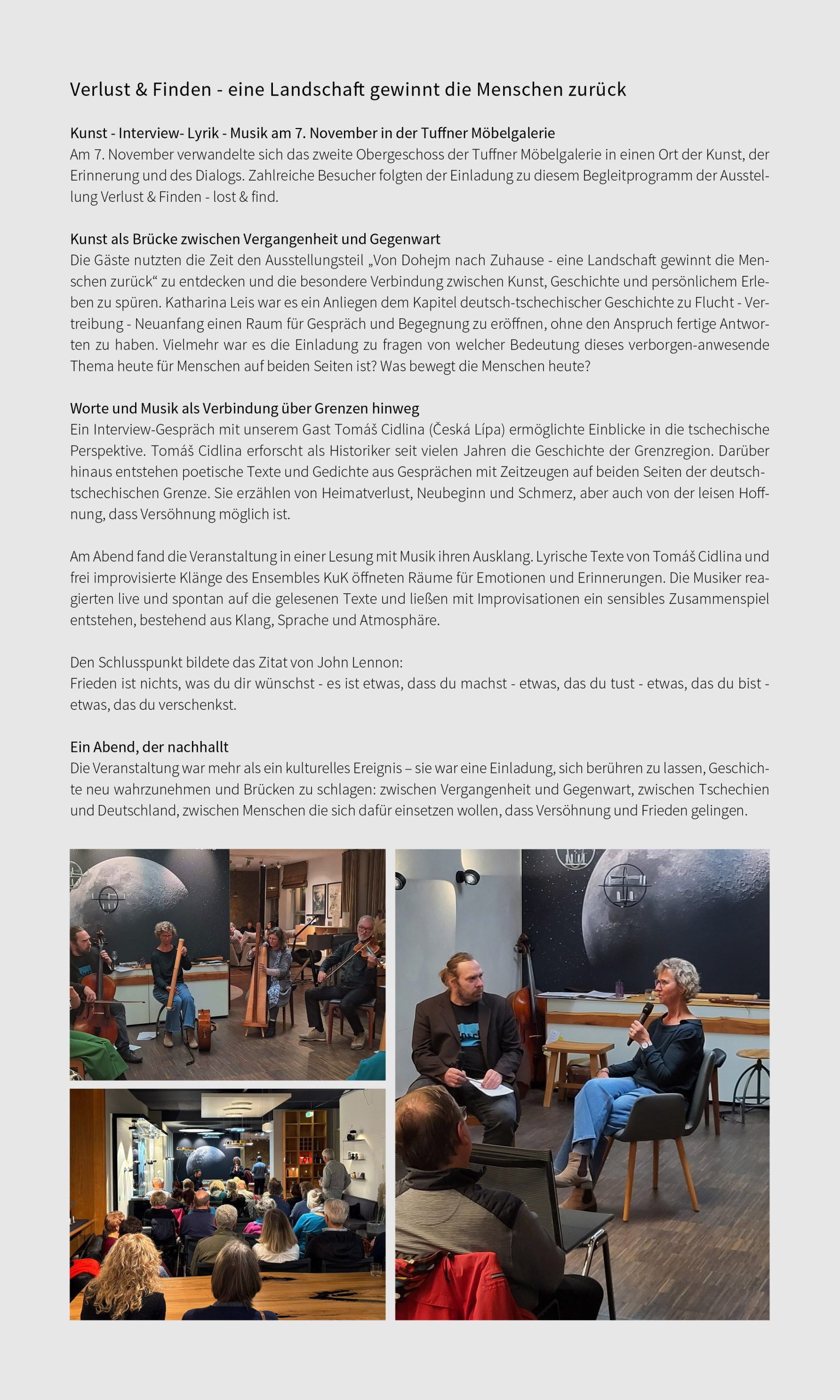 Nach einer intensiven Vorbereitungszeit erlebten wir am 13. September 2025 eine gelungene und wohltuende „Verlust & Finden“ – Ausstellungseröffnung. Mit Klick auf das Foto gelangen Sie zur Bildergalerie dieses gut besuchten Tages.